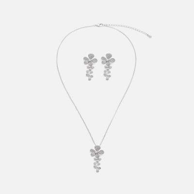 تمتعي بأناقة لا تضاهى مع سلسله ورده المميزة التي تأتي ضمن طقم نسائي أنيق بلون فضي راقٍ، يتكون من سلسال وحلق. التصميم الفريد لحلية الوردية المرصعة بفصوص الزركون البراقة